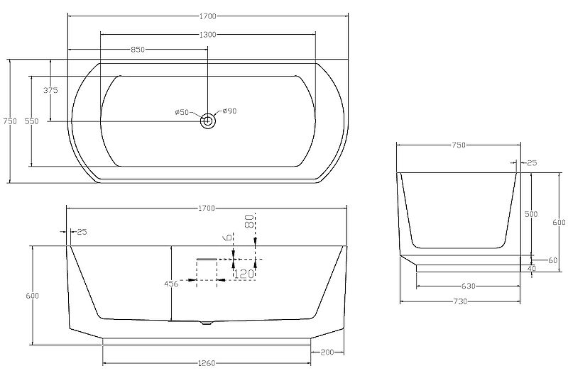 Акриловая ванна ABBER 170x75см AB9488-1.7