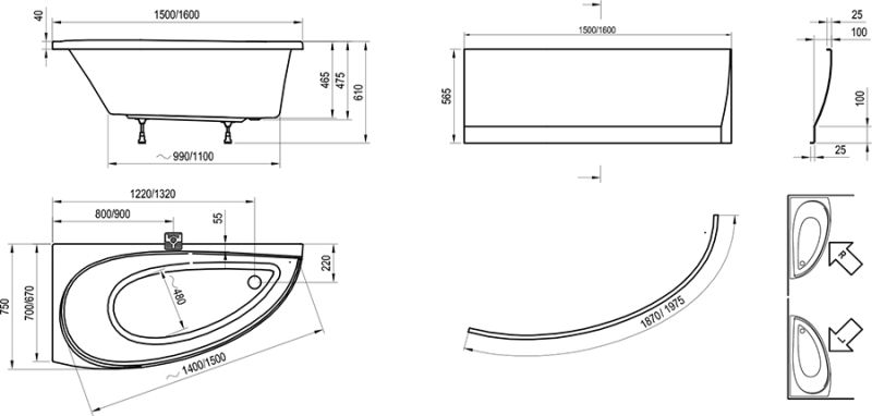 • аксессуары: передняя панель, сточный комплект для ванны