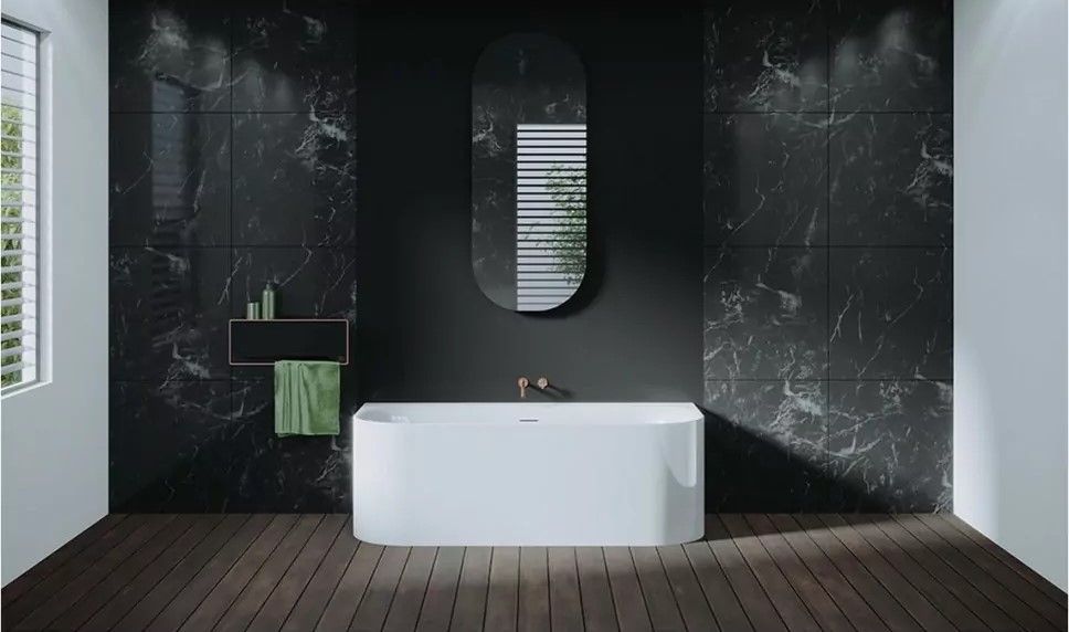 Пристенная глянцевая белая акриловая ванна RIHO DEVOTION с двойными стенками, со встроенным переливом и нажимным донным клапаном.