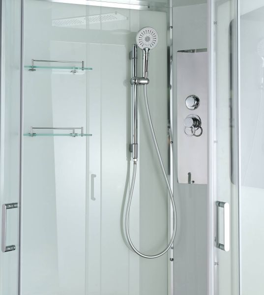 Стильная душевая кабина AvaCan сочетает в себе высокую функциональность, практичность и надежность. При изготовлении применяется безопасное закаленное стекло, надежно фиксируемое алюминиевым профилем. Профиль сделан из алюминия повышенной прочности. Сборка без силикона (увеличивает срок службы, защищает от протечек), внутренняя сборка (облегчает установку и ревизию; позволяет установить в ограниченном пространстве и обойтись без демонтажа других сантехнических приборов), смеситель резьбовой (без хомутов). Двойные металлические ролики дверей (распределение нагрузки на два ролика, увеличивают срок службы). Душевая штанга(позволяет регулировать по высоте ручную лейку), ручная арома-лейка с витамином С (картридж в комплекте,есть возможность замены или удаления картриджа), полочки(из стекла, с ограничителем), сифон с гидрозатвором.