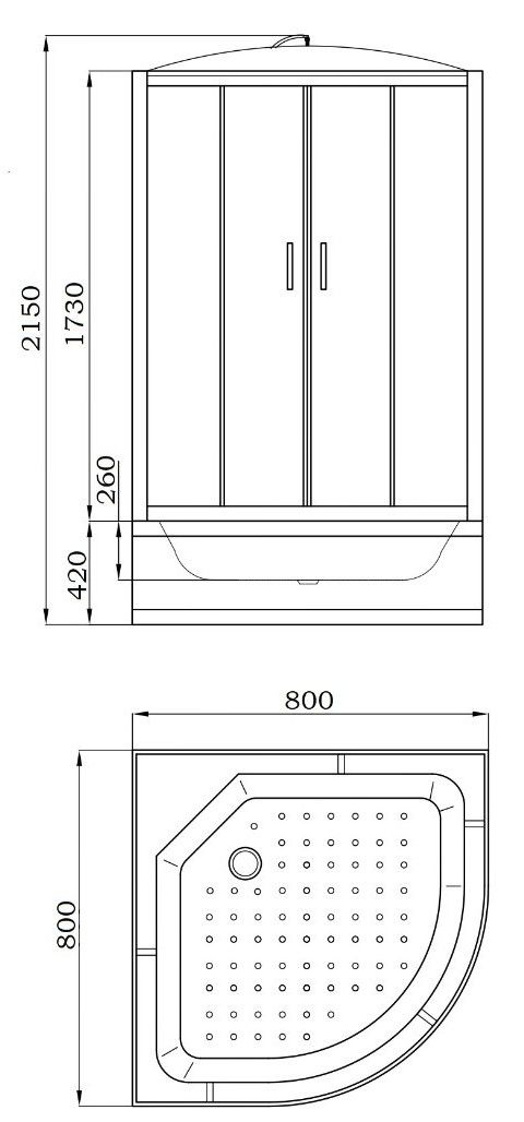 • Поддон: высокий 42 см, полукруглый, рельефное дно, литое сиденье.