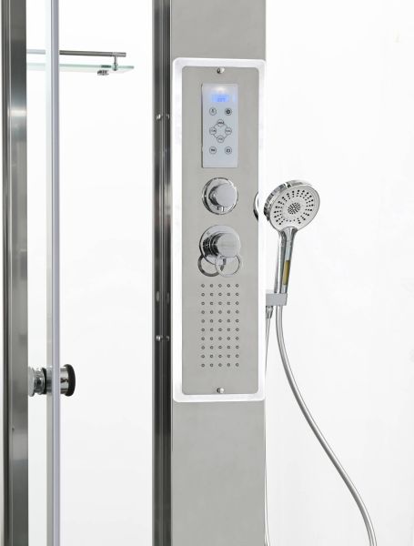 Стильная душевая кабина AvaCan сочетает в себе высокую функциональность, практичность и надежность. При изготовлении применяется безопасное закаленное стекло, надежно фиксируемое алюминиевым профилем.Профиль сделан из алюминия повышенной прочности. Сборка без силикона (увеличивает срок службы, защищает от протечек), внутренняя сборка (облегчает установку и ревизию; позволяет установить в ограниченном пространстве и обойтись без демонтажа других сантехнических приборов), смеситель резьбовой (без хомутов). Двойные металлические ролики дверей (распределение нагрузки на два ролика, увеличивают срок службы). Душевая штанга(позволяет регулировать по высоте ручную лейку), ручная арома-лейка с витамином С (картридж в комплекте,есть возможность замены или удаления картриджа), полочки(из стекла, с ограничителем), сифон с гидрозатвором, сенсорный пульт управления с функциями: блютуз, LED подсветка, радио, вытяжка, гидромассаж спины, тропический (верхний) душ.