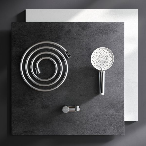 Уникальная технология Rub&Clean делает процесс очищения форсунок простым и удобным. Набор дополнен регулируемым держателем для ручного душа. Шарнирное соединение защищает душевой шланг от перекручивания.