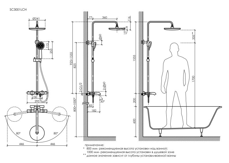 • Подходит для установки над ванной и в душевую зону