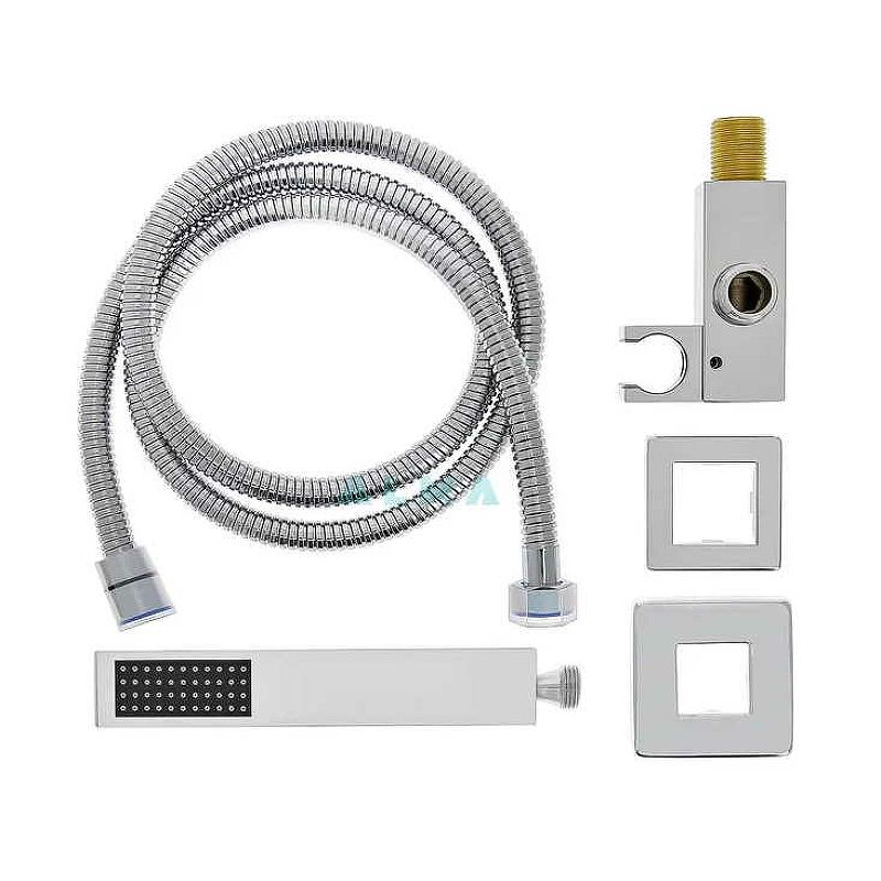 В правильно выполненном дизайне ванной комнаты нет ни одной лишней детали. Душевая система- это не только высококачественные современные технологии, это стильный дизайн и возможность добавить интересный акцент. Например, выбрав элегантный встраиваемый душевой комплект Elbe на 3 положения. Душ для тех, кто ценит каждый момент своей жизни. Комплектация: ? Излив поворотный латунь 24 см. ? Верхняя лейка нержавеющая сталь размер 25*25 см. ? Ручная лейка нержавеющая сталь. ? Длина верхнего кронштейна 40 см. ? Шланг 150 см. ? Встраиваемый смеситель латунь ? Глубина его погружения в стену 8 см.