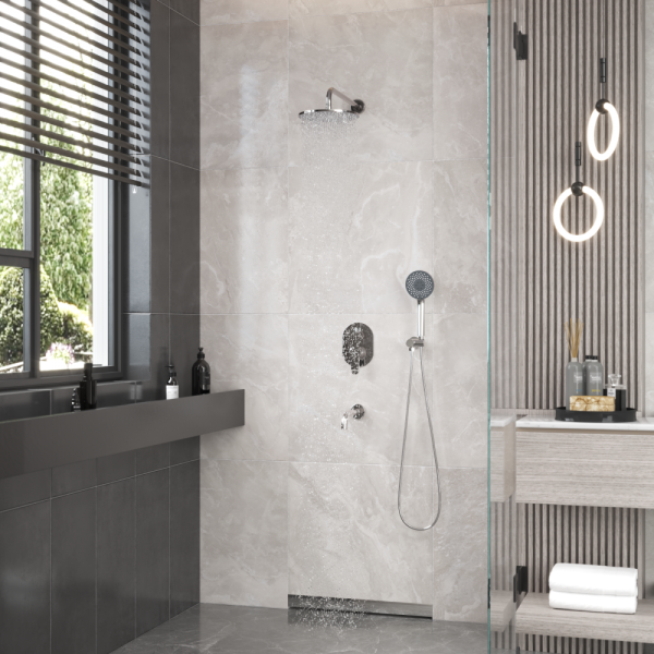 Душевой комплект BERGES VENTAS 3R - встраиваемый душевой комплект обладает трёхрежимной системой и состоит из верхней лейки - «тропического ливня», ручного душа, излива и смесителя.Лейка верхнего душа имеет инновационную систему самоочистки в виде гибких силиконовых вставок на форсунках душа, которые защищают изделие от известковых отложений. Верхний душ изготовлен из нержавеющей стали. Ручной душ – из ABS пластика. Оба душа имеют хромоникелевое покрытие, которое выглядит безупречно на протяжении всего периода эксплуатации.Шланг выполнен из нержавеющей стали (внутри epdm), смеситель с латунным корпусом имеет керамический картридж с пропускной способностью 28 л/мин, все держатели и кронштейны сделаны из латуни и нержавеющей стали.Скрытый монтаж комплекта позволяет создавать красивое и эргономичное внутреннее пространство всего помещения.