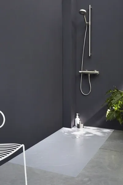 • Ультратонкий поддон для душевого пространства без внутреннего бортика, но с небольшим уклоном, достаточным для стекания воды в направлении слива