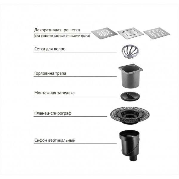Решетка толщина 3мм, нержавеющая сталь AISI 304Горловина трапа, пластикФланец трапа с переходником, РРМонтажная заглушка, PPСамопромывной S-образный сифон PPВертикальный выпуск, пропускная способность 48л/мин, монтаж 360°Монтажный ключ, пластик
