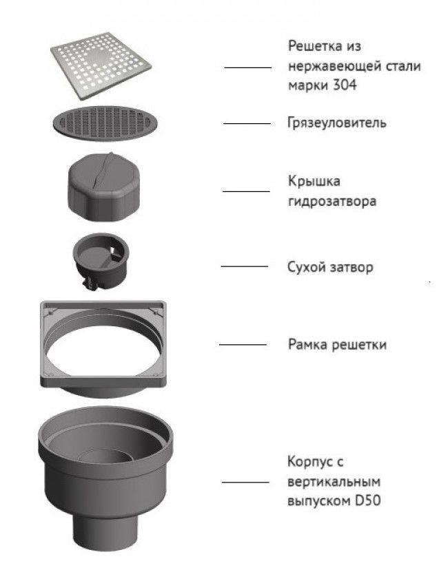 Решетка толщина 0,8 ммНержавеющая сталь AISI 304Горловина трапа пластикКомбинированный затворКорпус PP Вертикальный выпуск D50Монтаж 360°