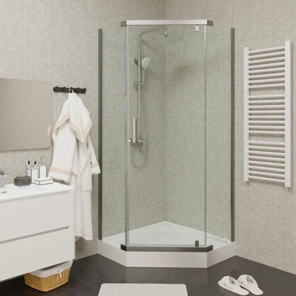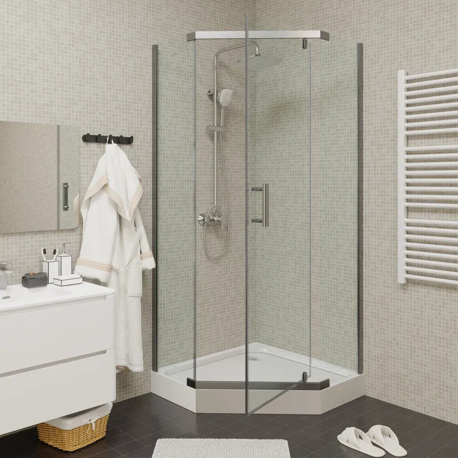 Уголок ZPE911TE душевой PARLY с поддоном (90х90х192)Размер: 90х90х192 смСтильный уголок пятиугольной формы с распашной дверью. Прозрачное стекло и полированный профиль придают модели визуальную легкость. Уголок не утяжеляет пространство и хорошо дополняет любое оформление ванной комнаты.