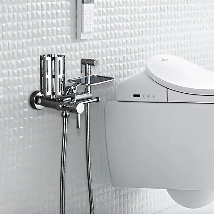 Оснащение: душевой шланг, держатель для душа, полочка, держатель туалетной бумаги, держатель освежителя воздуха