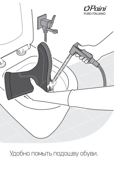 - С помощью гигиенического душа очень легко ополоснуть подошву обуви, горшок ребенка, лоток для животного.
