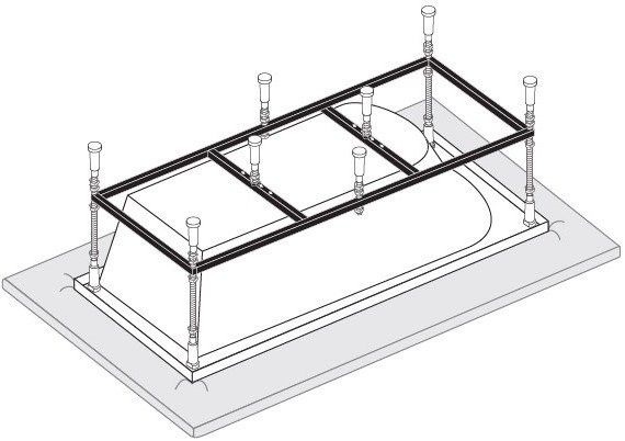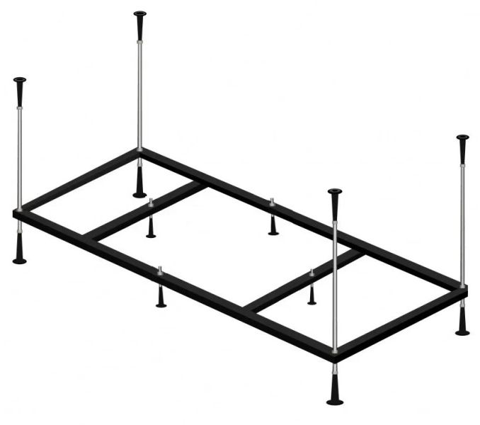 Усиленный цельносварной стальной каркас для ванны изготовлен из квадратного металлического профиля 2х2 см и окрашен темно-бронзовой молотковой краской. Каркас имеет 8 ножек и 4 опоры в борт ванны снизу. Предназначен для использования во влажных помещениях.