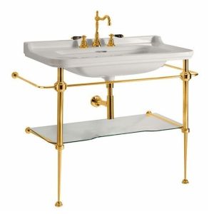 Kerasan Waldorf 9197K2 Консоль для раковины на 80 см. Металлическая структура для раковины 80см, со стеклянной полочкой, цвет золото (из 2-х коробок: арт. 919791+920291 и 920001). Подходит к 4141K1 Раковина керамическая 80х55 см, c 1 отверстием под смеситель, белая, 811391oro Заглушка для перелива, цвет золото.