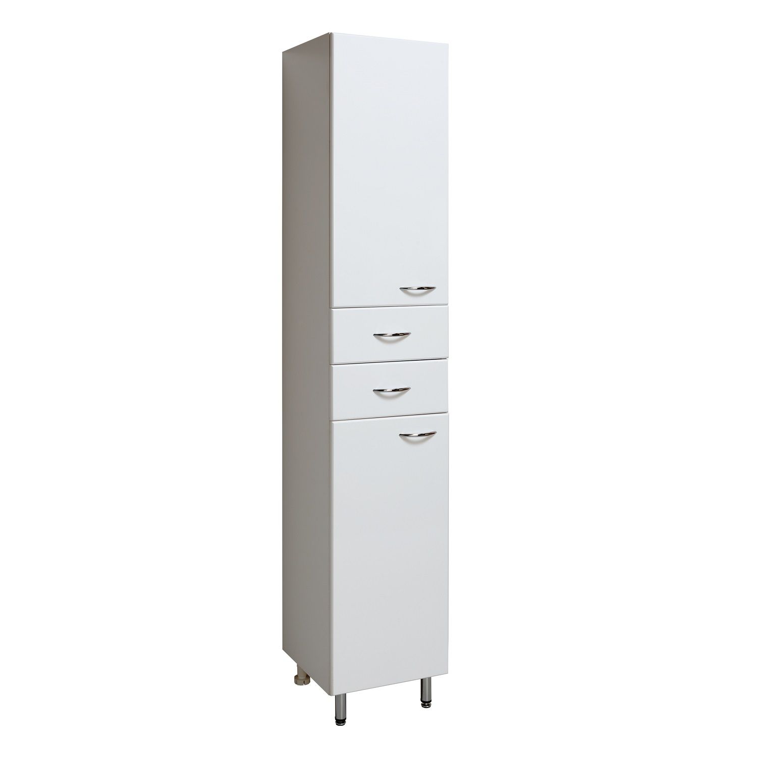 Шкаф-колонна напольный с двумя распашными дверками и выдвижными ящиками. В нижнем и верхнем отделениях - по одной внутренней полке. Ящики - на шариковых направляющих. Петли со встроенным доводчиком, ручки - 4 шт, ножки хром - 2 шт, ножки пластик -2шт.