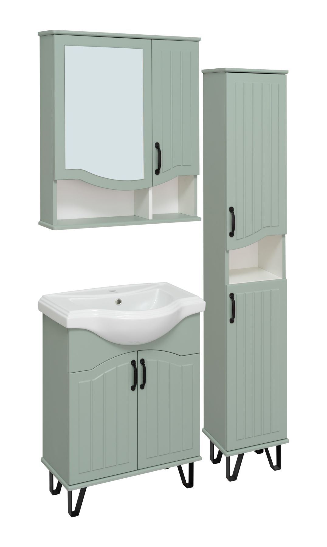 Шкаф-колонна напольный с двумя распашными дверками и открытой нишей посередине. В верхнем и нижнем отделениях по одной встроенной полке. Петли со встроенным доводчиком, ножки черные пластиковые -4шт, ручки черные -2шт. Корпус и фасады покрыты пленкой в цвете мята, что в сочетании с черной фурнитурой делают мебель стильной и оригинальной. Выпускается только в правом исполнении.