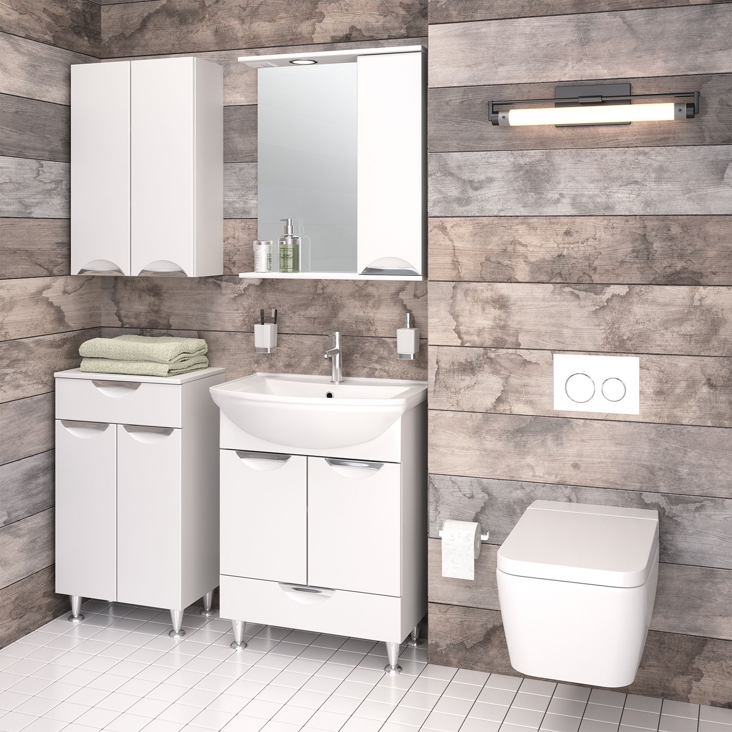 Тумба в ванную (полупенал) с одним выдвижным ящиком и двумя распашными дверками, за которыми одна встроенная полка. Петли со встроенным доводчиком, ручки врезные - 3шт, ножки хром - 2шт, ножки пластик -2шт.