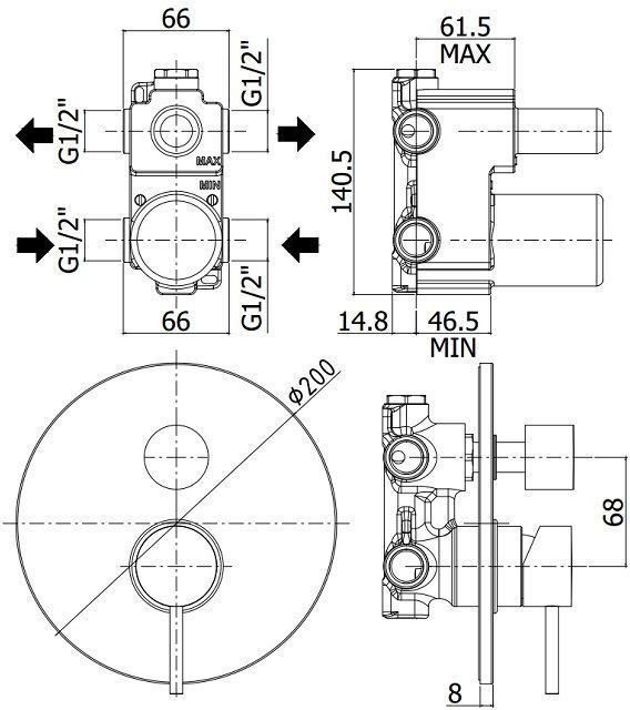 Смеситель встраиваемый для душа на 2 выход с накладкой из металла диам.200мм, девиатор-картридж, 2 положения+1 комбо, Черный матовыйСмеситель для душа Paffoni Light LIG018NO (с внутренней частью) предназначен для душа. Своим сдержанным дизайном и колористикой он внесет в интерьер помещения особое настроение, подчеркнув его своеобразие. Он изготовлен из надежного материала латунь, который не подвержен коррозии, а потому прослужит верой и правдой. Модель является прекрасным примером продуманной конструкции. Управление в смесителе предусмотрено однорычажное, что отвечает пожеланиям любителей такого типа смесителей. Высокую надежность и долговечность смесителю гарантирует керамический картридж, отличительной чертой которого является выверенная конструкция - залог четкой работы в течение долгого времени. Не напрасно гарантия на смеситель – 5 лет, в течение которого компания Paffoni заверяет в его бесперебойной работе. Форма излива в смесителе - нет, а тип - нет. При покупке учтите, что подводка у смесителя жесткая, что необходимо знать для его монтажа.