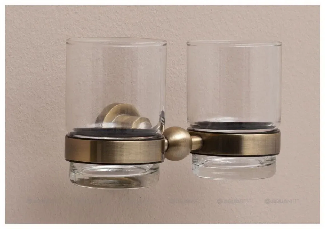 Стакан Aquanet 3884D (двойной) выполнен в ретро-стиле. Колорит изделию придает золотисто-медный оттенок латуни и живописные элементы декора. Одним из таких элементов служит оригинальной формы деталь, которая является одновременно креплением аксессуара к стене, в которой прячутся крепежи, с другой к ней присоединяются два кольцеобразных элемента, в которых помещаются стаканы. Лаконично и эффектно. Выполнено основание модели из латуни - сплава меди с цинком. Этот материал зарекомендовал себя как надежный и стойкий к коррозии, что для влажной среды особенно актуально.