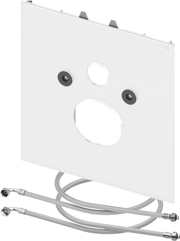 Нижняя стеклянная панель для унитазов TECEone с функцией биде, включая звукоизоляционный комплект и армированные шланги для подсоединения горячей и холодной воды к стандартным угловым вентилям. Стекло белое. Размеры (в x ш x г): 446 x 430 x 16 мм Примечание. Для подключения к предварительно установленным угловым вентилям.
