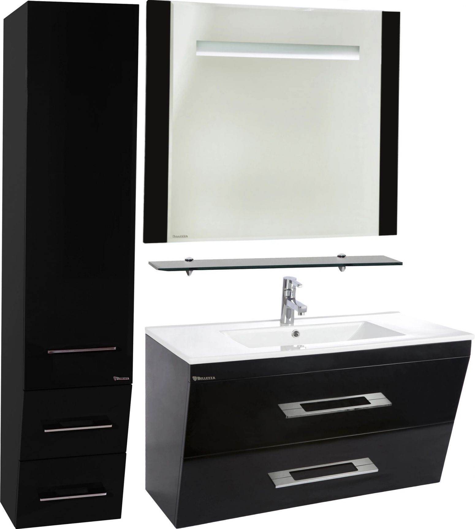 Тумба Bellezza Берта шириной 90 см в черном глянцевом исполнении — это смелое решение для современных ванных комнат, где дизайн встречается с функциональностью. Модель с интегрированной раковиной и двумя вместительными ящиками демонстрирует внимание к деталям: от премиальных материалов до продуманной эргономики.