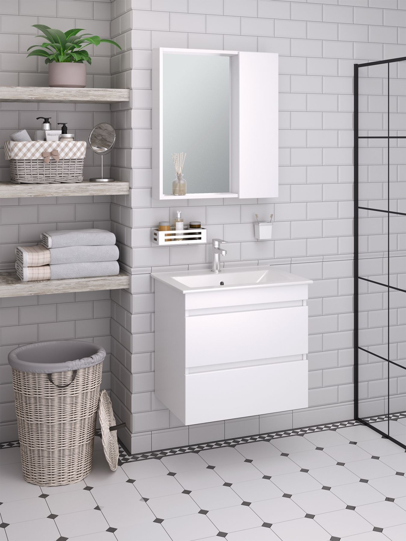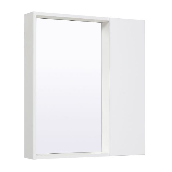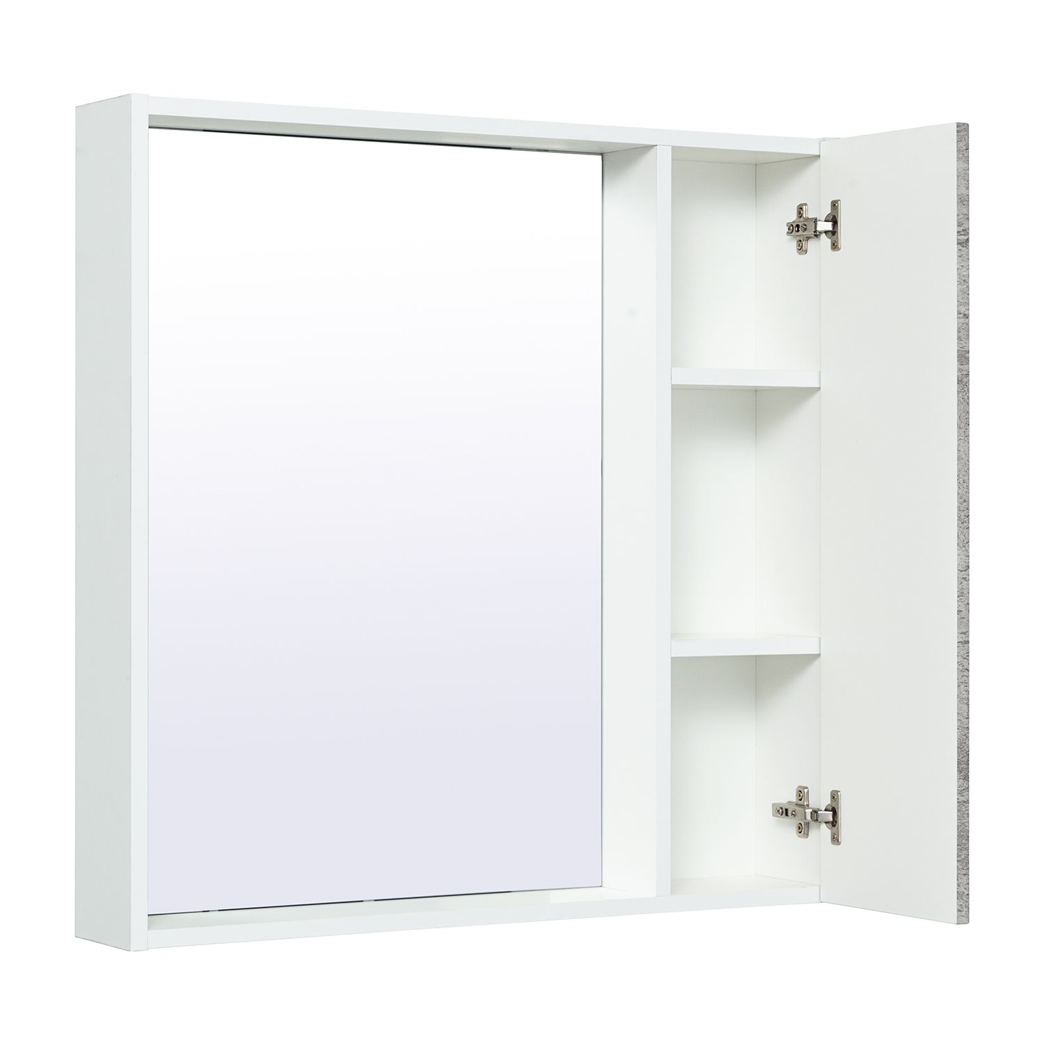 Зеркальный шкаф без подсветки и с открытой нижней полкой. Справа или слева (зависит от установки) шкафчик с распашным фасадом, за которым две внутренние полки. Петли со встроенным доводчиком. Универсальный.