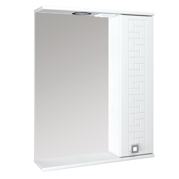 Зеркальный шкаф оборудован одним врезным светодиодным светильником 220В и розеткой с выключателем. Справа шкафчик с распашным фасадом, за которым две внутренние полки. Петли со встроенным доводчиком, ручка -1 шт. Выпускается только в правом исполнении.