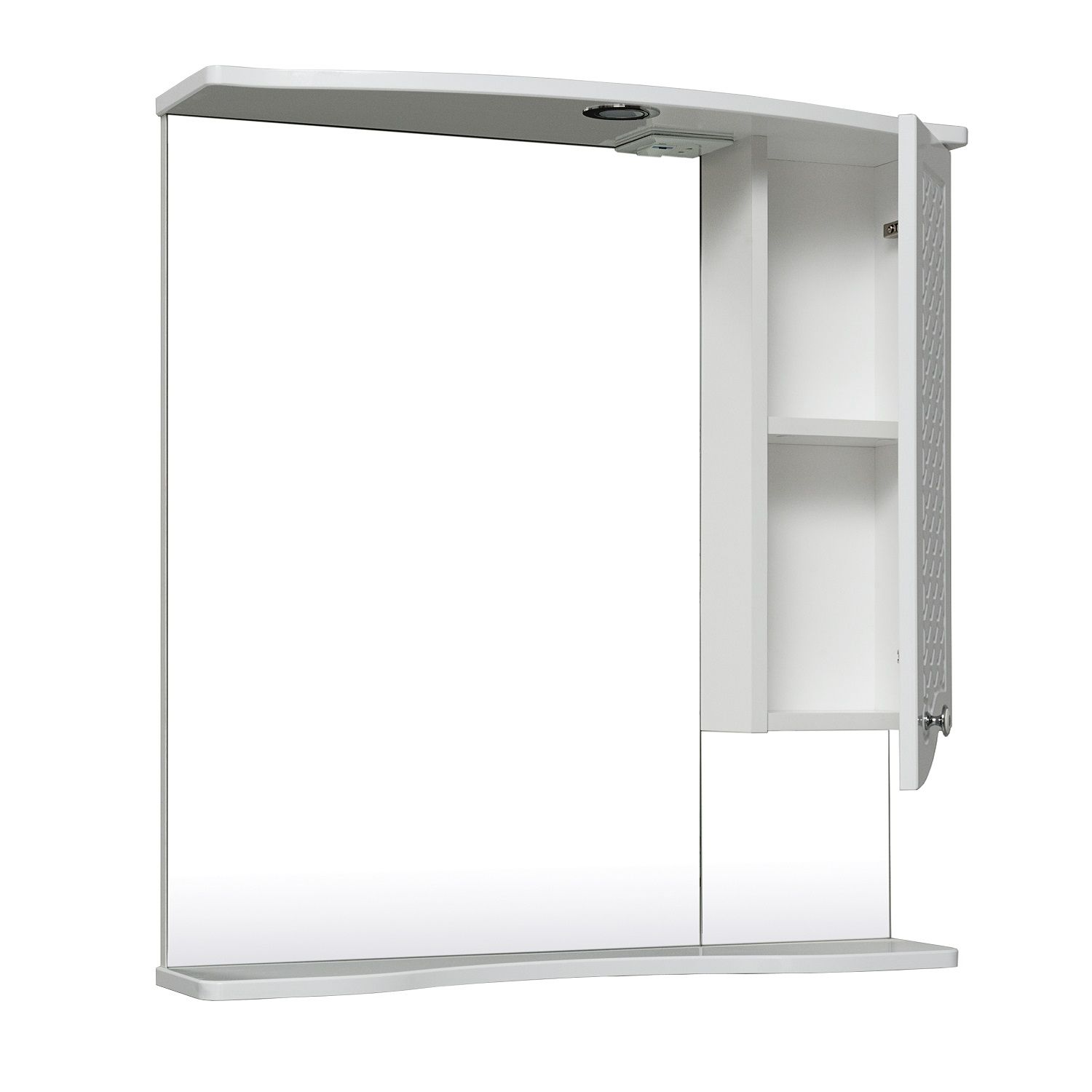 Зеркальный шкаф оборудован одним врезным светодиодным светильником 220В и розеткой с выключателем. Справа - шкафчик с распашной дверцей и одной внутренней полкой. Под зеркалом - нижняя полка. Петли со встроенным доводчиком, ручка - 1шт. Выпускается только в правом исполнении.