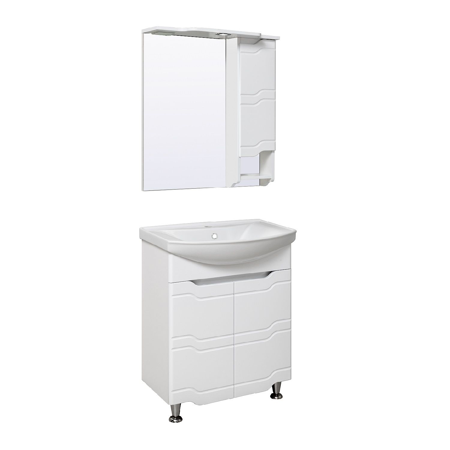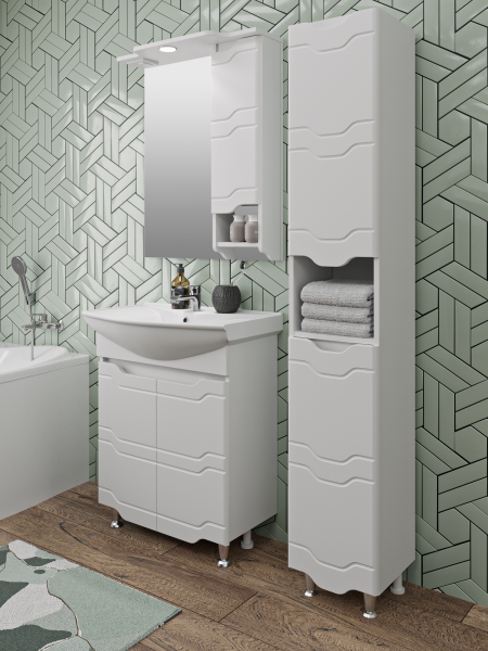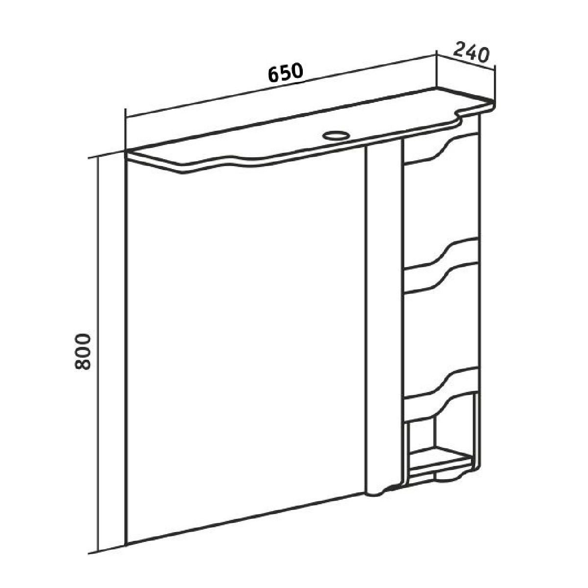 Зеркальный шкаф оборудован одним врезным светодиодным светильником 220В и розеткой с выключателем. Справа - шкафчик с распашной дверцей и одной внутренней полкой. Под шкафом - открытая полочка. Петли со встроенным доводчиком. Выпускается только в правом исполнении.