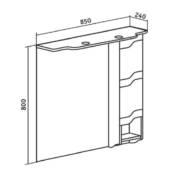 Зеркальный шкаф оборудован двумя врезными светодиодными светильниками 220В и розеткой с выключателем. Справа - шкафчик с распашной дверцей и одной внутренней полкой. Под шкафом - открытая полочка. Петли со встроенным доводчиком. Выпускается только в правом исполнении.