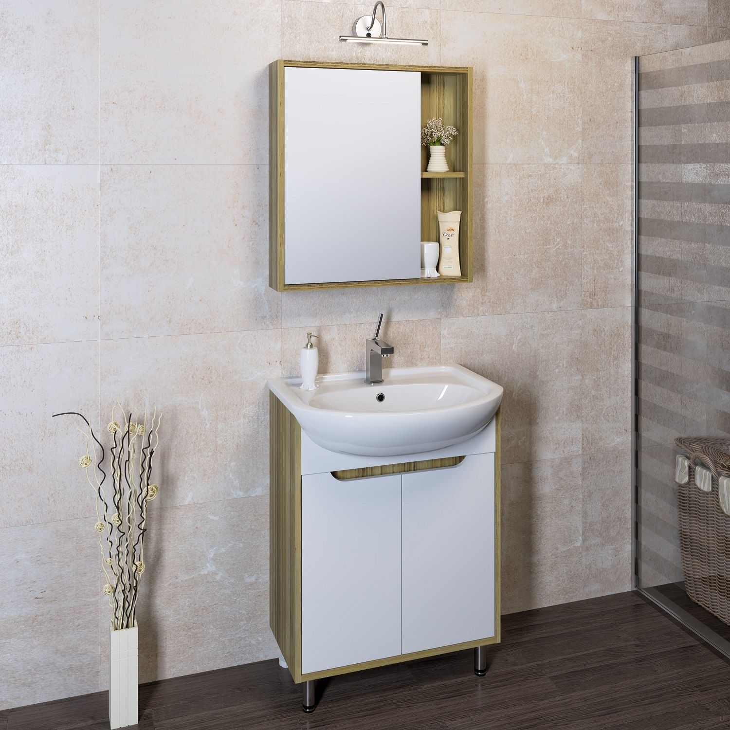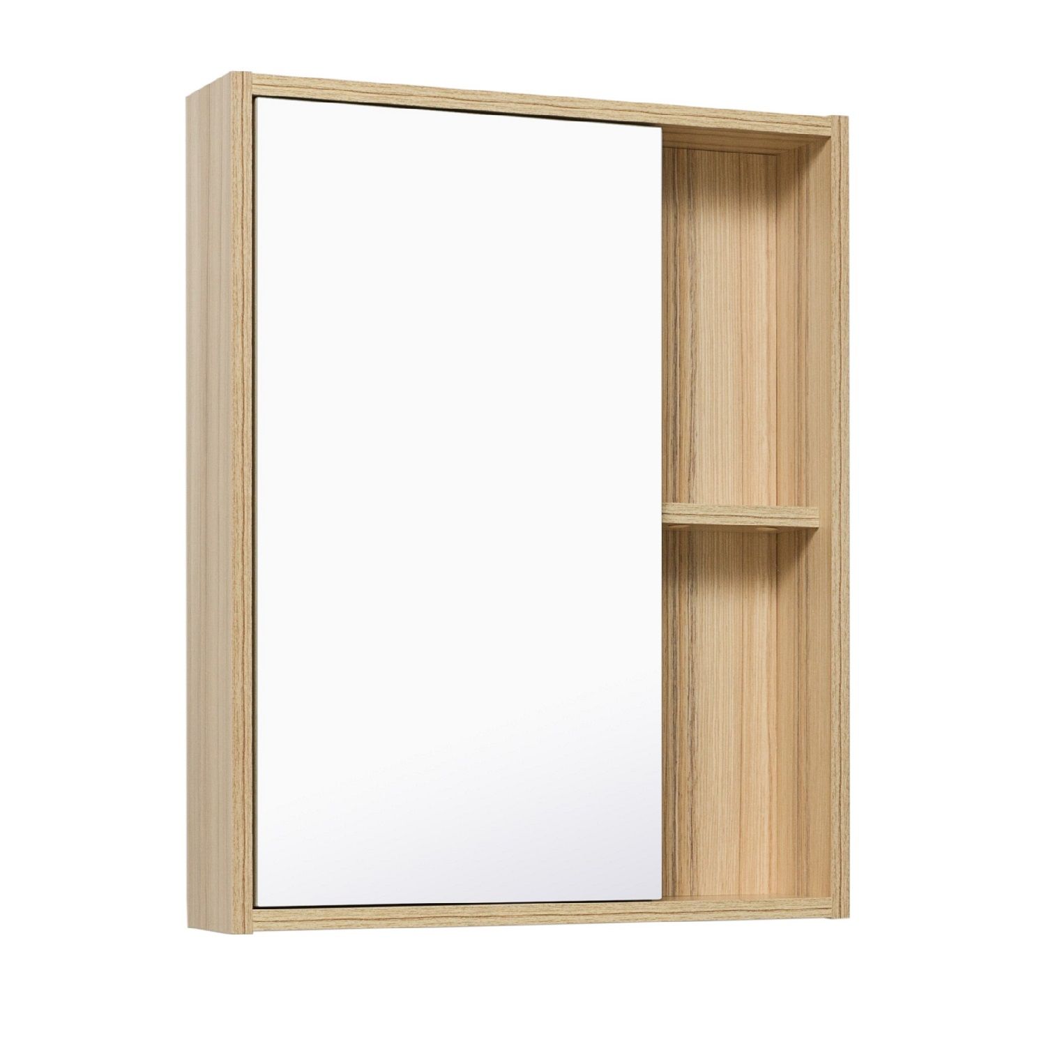 Зеркальный шкаф без подсветки с одной распашной дверкой и открытыми полками (слева или справа, зависит от установки). Внутри шкафа -одна внутрення полка. Универсальный.